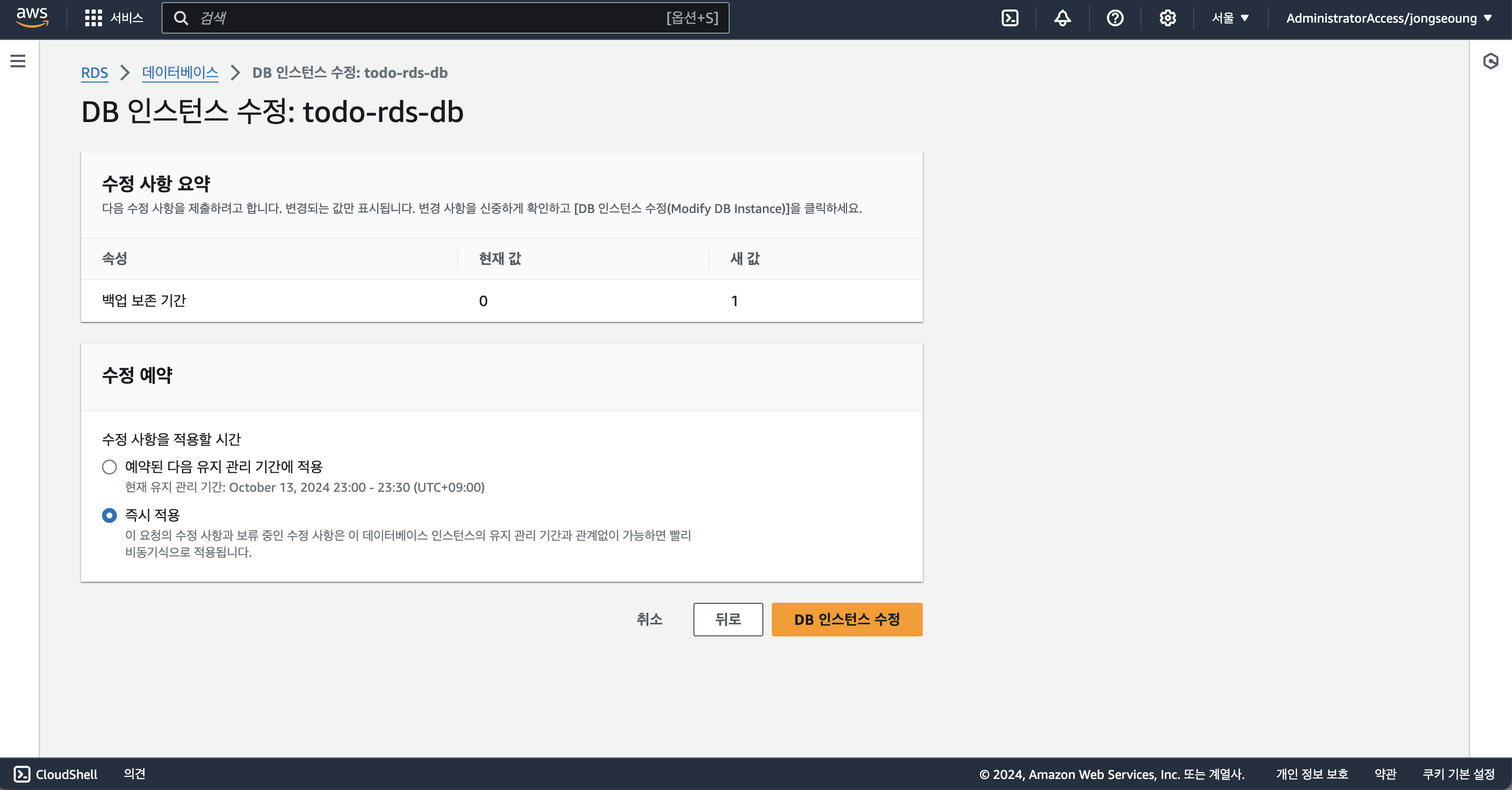 데이터베이스가 메인 인스턴스 윈도우 기간에 업데이트를 진행하도록 할 수 있고, 즉시 수정하도록 할 수 있다. 만약 데이터 베이스가 중단되거나 성능에 영향을 미칠 수 있는 수정일 경우에는 메인 인스턴스 윈도우 수정 기간에 수정하도록 하고 지금은 즉시 수정해주도록 하였다.