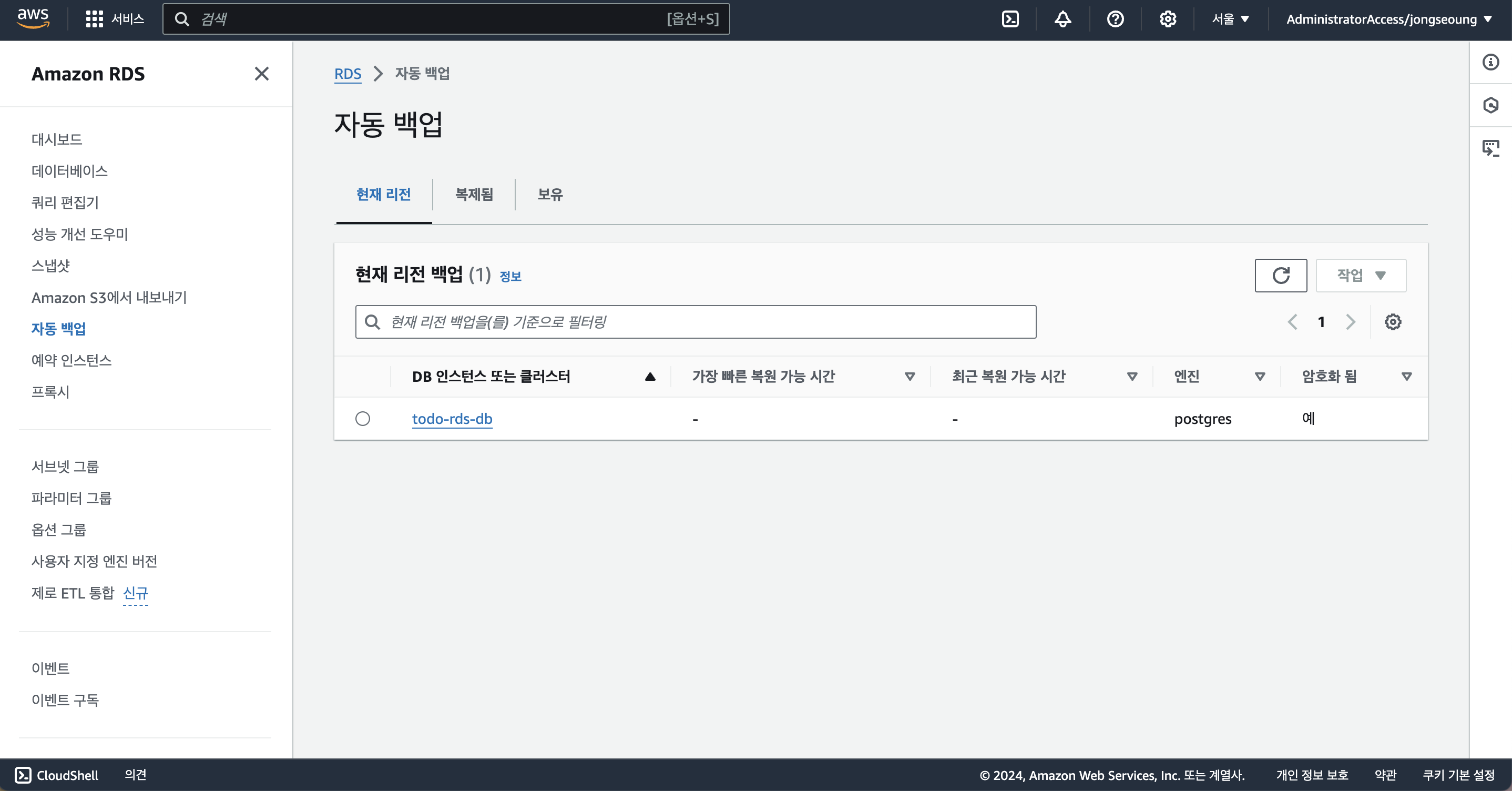 자동 백업을 활성화 해주기 위해서 데이터베이스를 선택하고 수정을 해준다. 그럼 아래 쪽에 백업 보존 기간은 자동으로 생성된 스냅샷에 대해 얼마나 보관할지에 대한 설정을 할 수 있다. 기존 0으로 설정되어 있었는데, 최저 비용으로 백업을 하기 위해 1일을 선택해주고 업데이트 해주었다.