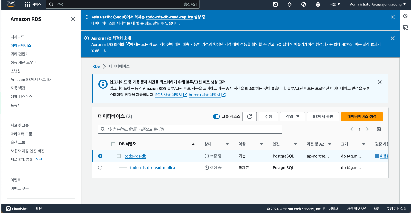 | [AWS] RDS 고가용성 확보를 위한 Multi AZ (1) | 2024.10.11 |