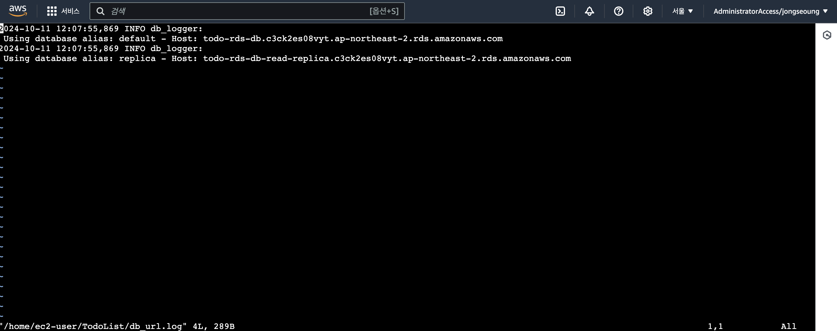 확인 방법은 애플리케이션의 요청에 따른 연결된 RDS의 엔드포인트를 로그 파일에출력 하도록 설정해놨다.