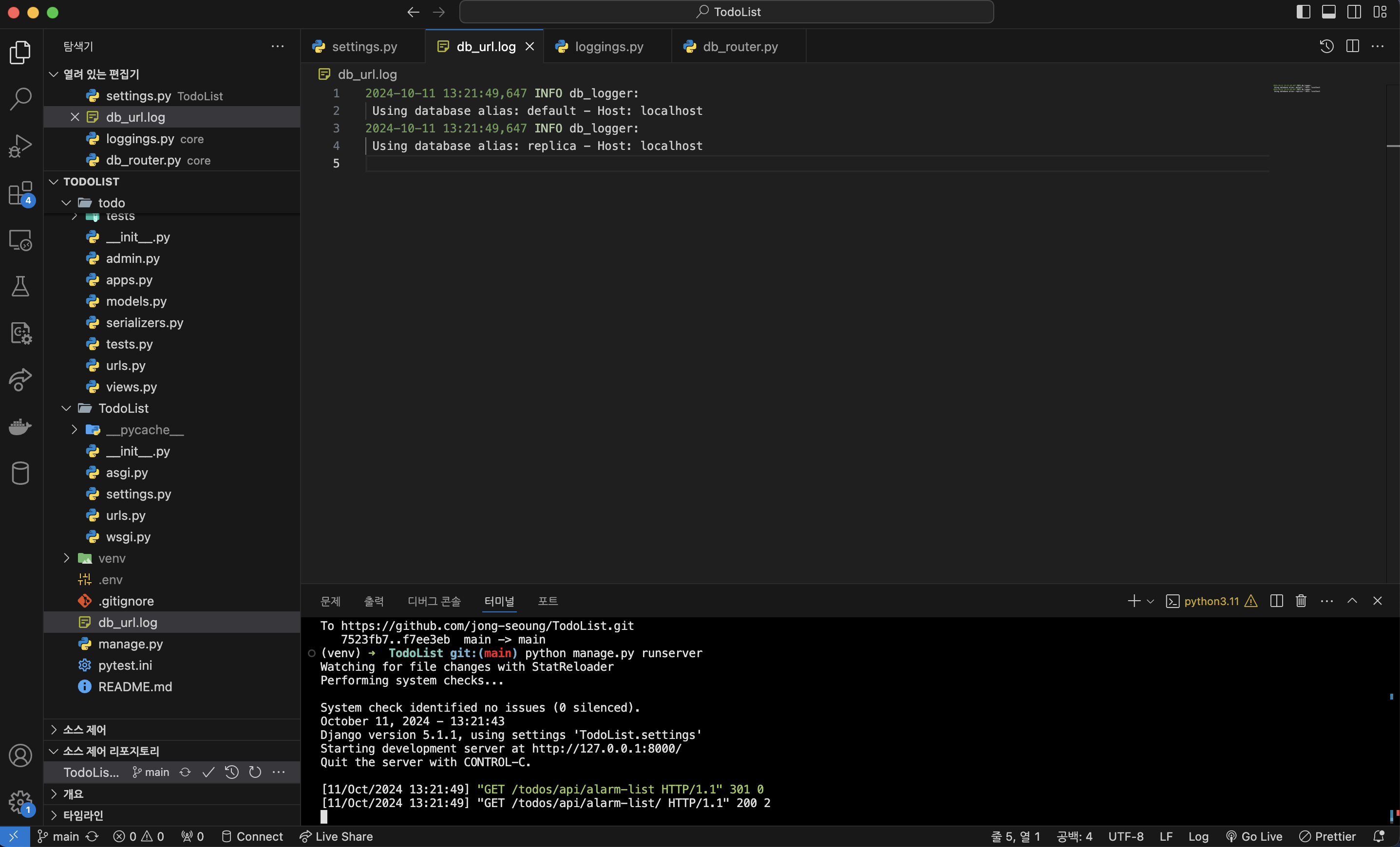 이제 어떤 데이터 베이스를 사용하는지 확인하고 싶은 View에 log_db()를 작성하고, api를 호출해서 log 파일에 정상적으로 출력이 되는지 확인해 보면 된다.