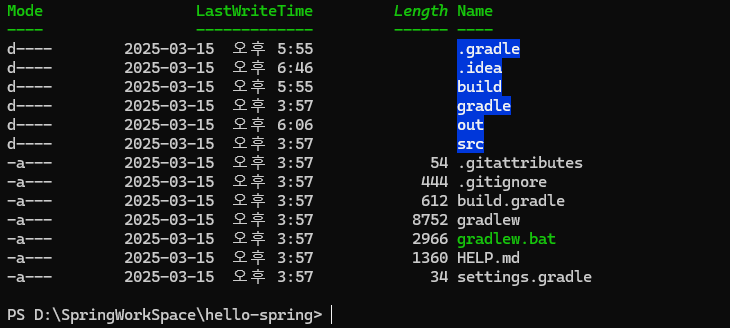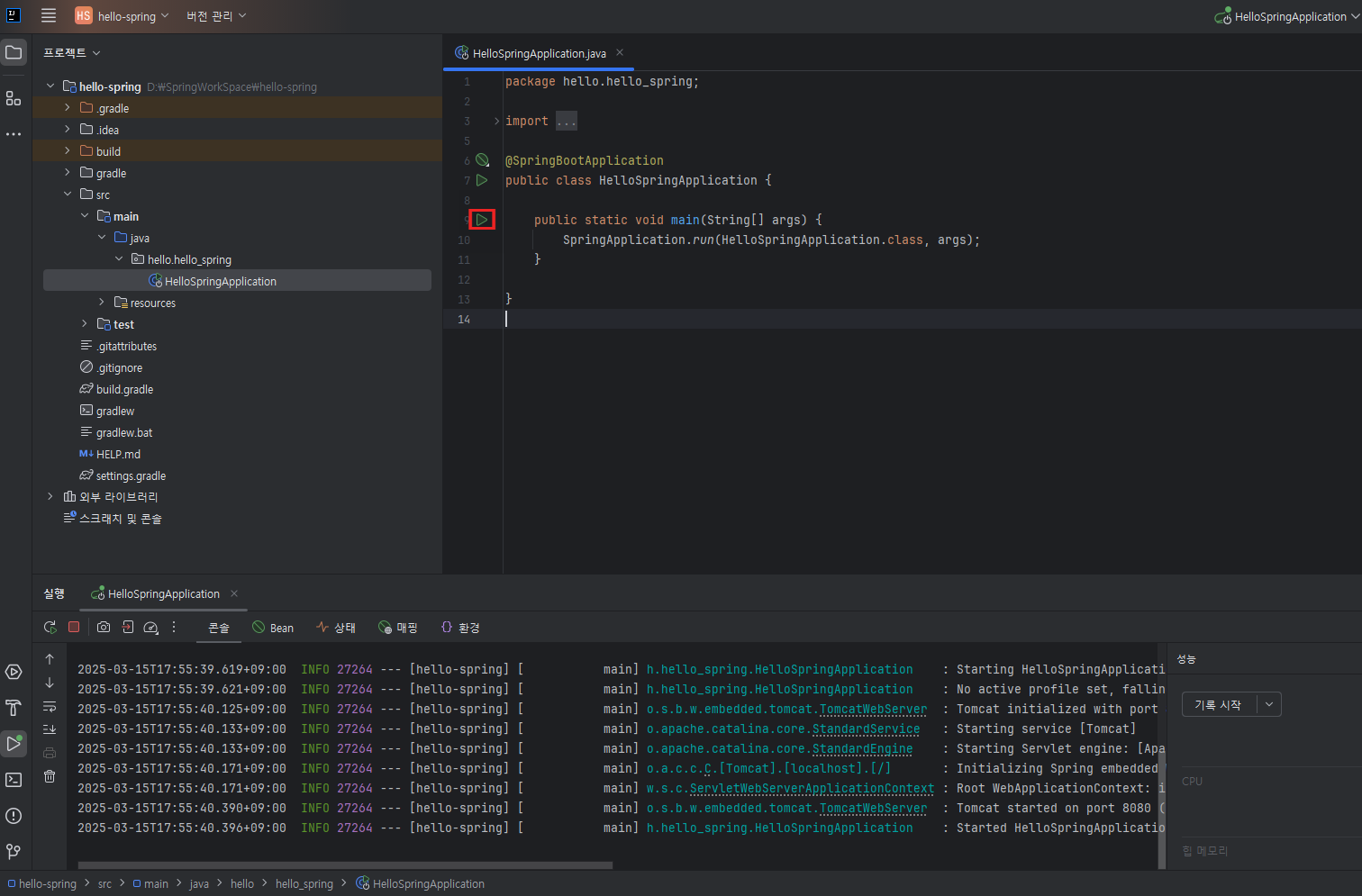 src - main - java - hello.hello_spring - HelloSpringApplication 파일을 열어서 이미지 부분의 화살표를 클릭하면 프로젝트가 동작이 된다.